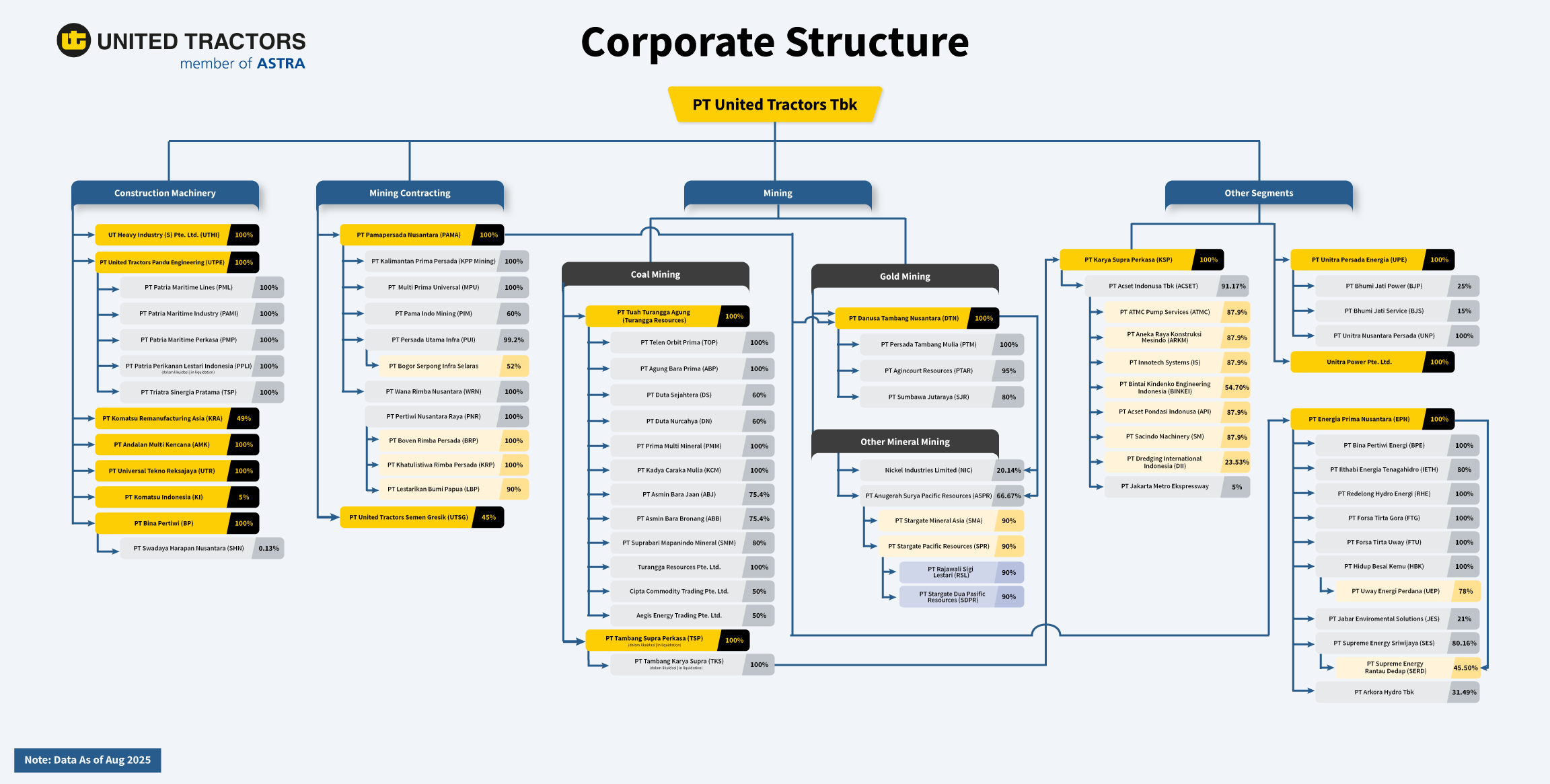 PT United Tractors Pandu Engineering (UTPE) bergerak di industri rekayasa dan manufaktur komponen dan attachment alat berat. Selain itu, UTPE juga memiliki anak perusahaan yang berhubungan dengan transportasi batubara melalui laut dan sungai.